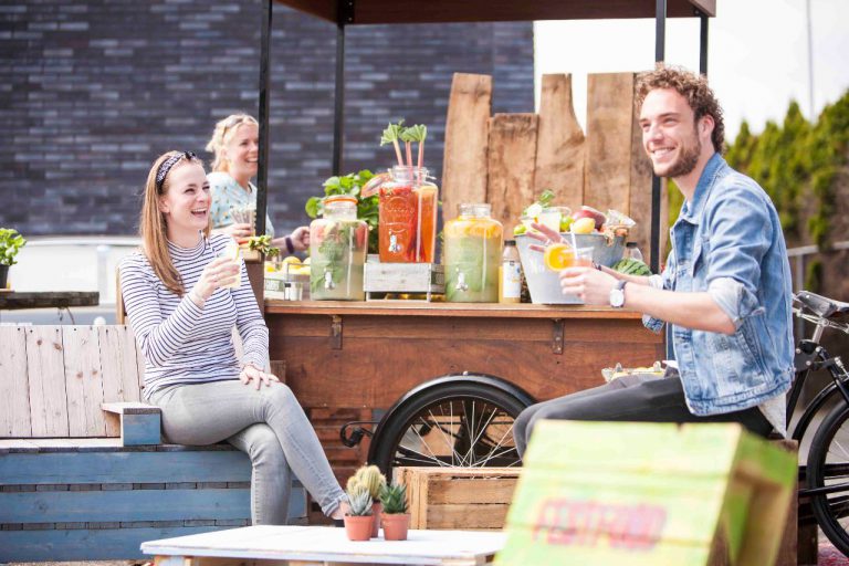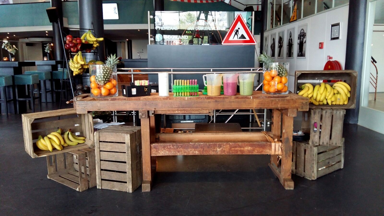 Om de lekkerste sapjes te kunnen maken op een hoog tempo, dienen we goed en efficient te kunnen werken. Daarnaast is het belangrijk dat jouw gasten of bezoekers zien dat er verse sappen te verkrijgen zijn en bovendien dient alles er aantrekkelijk uit te zien. Een standaard tafel is daarom minder geschikt om verse juices op te maken en daarom adviseren wij altijd om ook onze mobiele juicebar te huren wanneer je ons wilt inzetten.